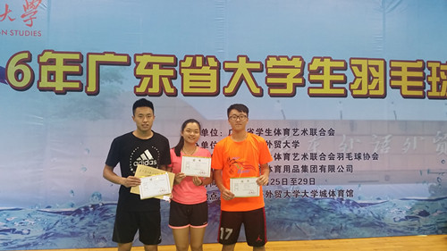 2016年广东省大学生羽毛球锦标赛5月29日在广东外语外贸大学体育馆降下帷幕。由张力平领队、林军教练带领的我校3名队员精简羽毛球队,经过4天紧张激烈的角逐,分别获得男子单打亚军、混双第七名的好成绩。