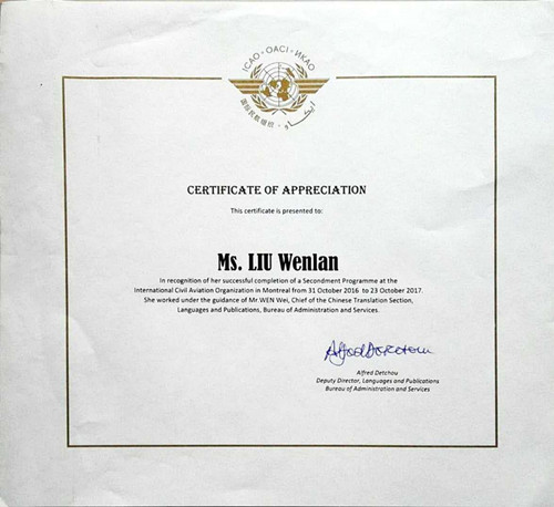 第二项内容由英语教学部刘文兰老师为大家分享她在国际民航组织工作一年的经验与感受。刘文兰老师经过民航局选拔,于2016年10月25日至2017年10月24日前往加拿大执行“中国民航派员到ICAO借调工作”任务,为国际民航组织行政服务局中文笔译科担任同声传译/笔译工作,主要为大会、理事会及其下设委员会、秘书处等的各类文件提供翻译服务。在一年的外调工作期间,刘文兰克服了工作、家庭、生活等方面的多种困难,出色地完成了自己的工作任务,得到了国际民航组织相关部门的嘉奖,充分展示了我院女教师政治素质好、思想品德高、职业技能精、工作能力强的良好形象。刘文兰老师在分享经验的同时,也对我校的国际化发展提出了期盼,希望我校利用国际民用航空组织的活动和平台,拓展我校教师的国际视野,紧跟国际民航前沿,提升教师的专业水平。同时,抓住国际民航的发展趋势,将其与我校民航相关专业的教学相结合,推动我校专业教学的动态发展。