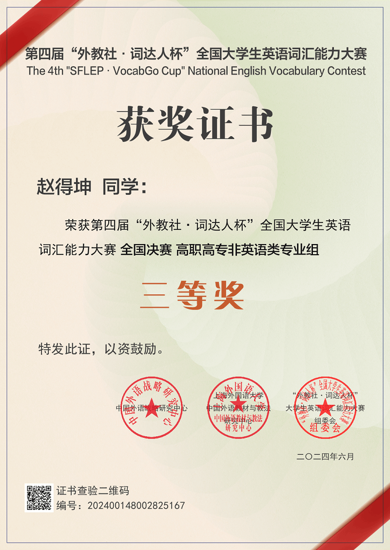 2024年3月-5月,由中国外语战略研究中心、中国外语教材与教法研究中心和上海外语教育出版社联合举办的第四届“外教社·词达人杯”全国大学生英语词汇能力大赛圆满结束。我校三个校区,800多名同学积极参与此项赛事,并取得可喜的成绩。37名同学荣获省赛特等和一、二、三等奖项,其中23级飞机部件修理赵得坤同学荣获全国三等奖。