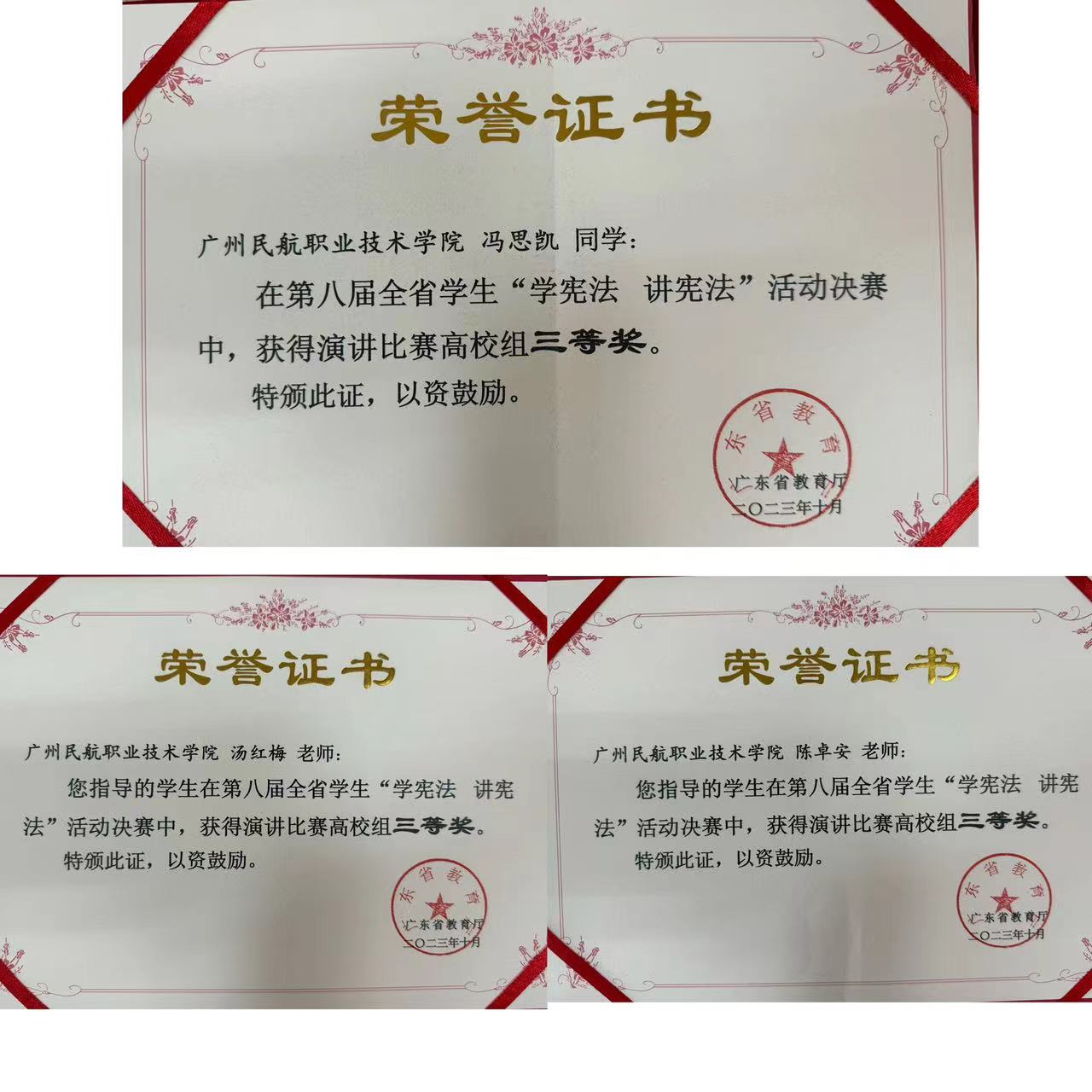 为全面学习宣传贯彻党的二十大精神,深入学习贯彻习近平法治思想,持续推进青少年宪法学习宣传教育,根据《广东省教育厅关于举办第八届全省学生“学宪法 讲宪法”活动的通知》,校团委积极组织学生参加了此次活动。通过系列活动比赛,我校飞机维修工程学院冯思凯同学在比赛中获得全省学生“学宪法 讲宪法”活动决赛演讲比赛高校组“三等奖”,汤红梅、陈卓安担任指导老师。