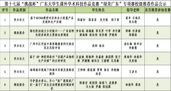 为深入学习贯彻习近平生态文明思想,推进绿美广东生态建设的有关部署,为打造人与自然和谐共生的绿美广东样板提供青年智慧,根据《关于举办第十七届“挑战杯”广东大学生课外学术科技作品竞赛“绿美广东”专项赛的通知》要求,我校深入落实文件精神,切实组织开展校内遴选推荐工作。秉持公平公正原则,经校外专家盲选评审,我校拟推荐6个作品参加省级评选,现将拟推荐作品公示如下:
