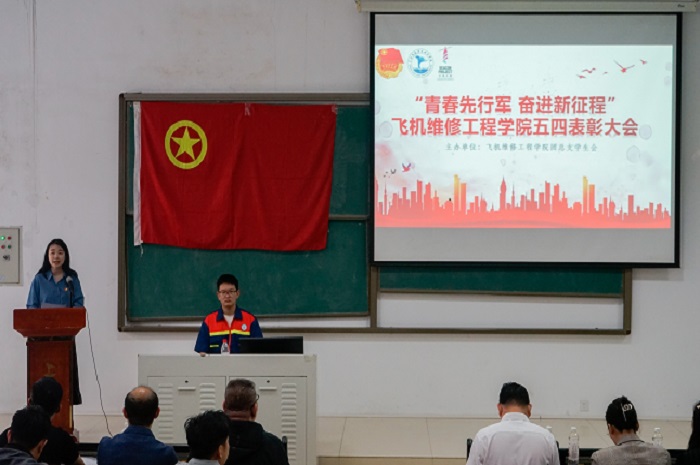 为总结成绩、表彰先进、鼓励青年,5月12日下午飞机维修工程学院在白云机场校区A2阶梯一教室隆重举行“青春先行军,奋进新征程”五四表彰大会。飞机维修工程学院党总支部方松书记、田巨院长、黄白玲副院长、陆轶副院长、学工办余振华主任、校团委组织宣传科张杨副科长、学院团总支各委员、全体辅导员及部分团员和青年代表出席此次大会。