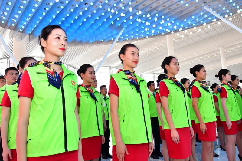 自广州白云国际机场志愿者招募工作开展以来,学院高度重视,以此次志愿服务活动为契机,创新志愿服务活动形式,助力民航人才输出,搭建志愿服务常态化、制度化、专业化发展平台。通过高标准、严要求的志愿服务培训和岗位实训,我院共有52名志愿者有幸成为首批广州白云机场志愿者在T2航站楼誓师上岗,其中来自2017级空中乘务专业的平金浩、芦孟娇同学作为领誓人,带领志愿者宣誓,共享这庄严美好时刻!随后,在广州白云国际机场股份有限公司党委委员、总经济师谢冰心的带领下,各单位相关负责人共同参观了T2航站楼,在充分感受到T2航站楼所突显出来的科技、智能、绿色元素外,也充分彰显了航站楼的人文关怀和真情服务理念。
