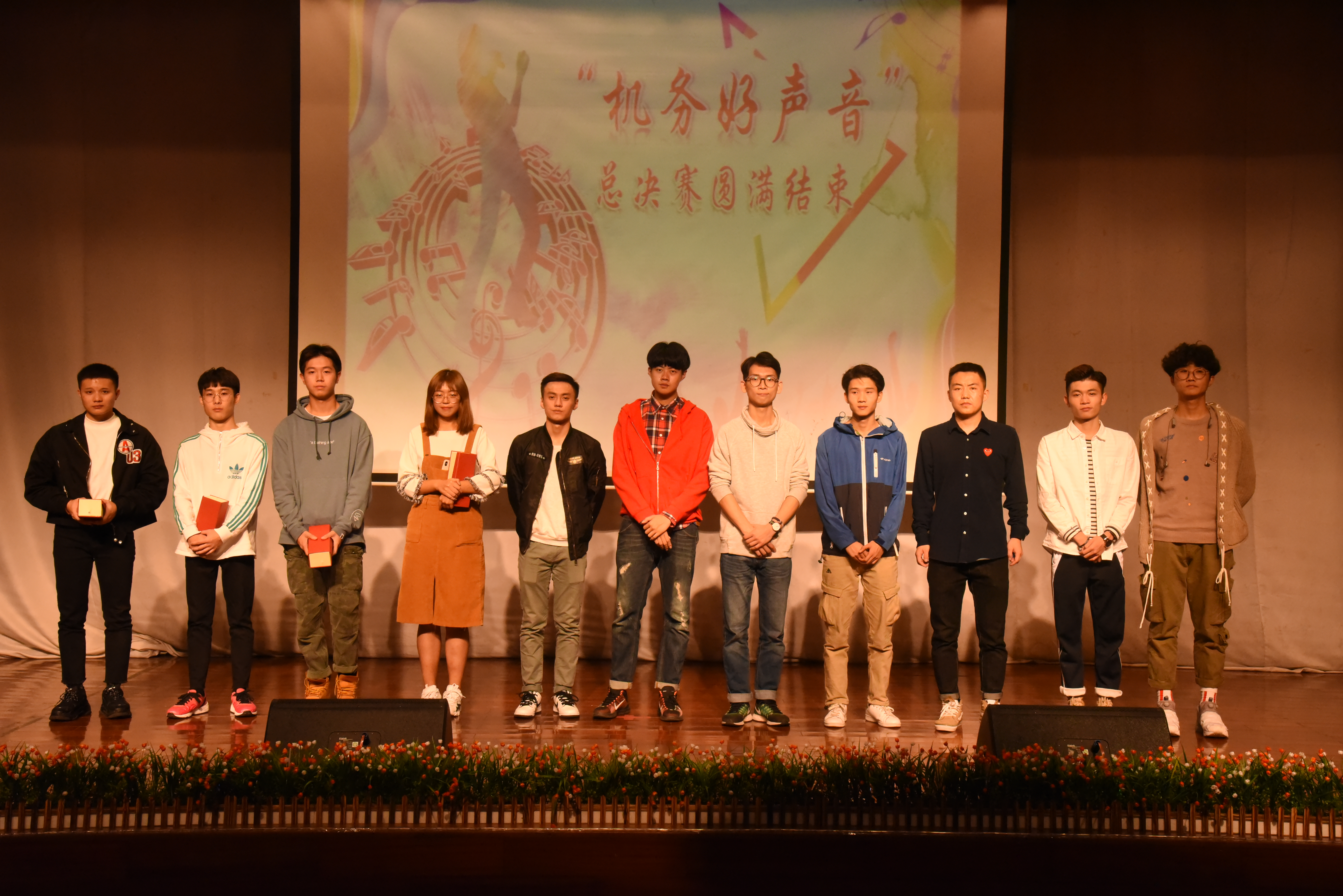 在决赛中,来自2017级的13位比赛选手依次演唱了《我真的受伤了》、《爱如潮水》、《月半小夜曲》等耳熟能详的歌曲,现场气氛热烈。选手们凭借自身实力和个人魅力赢得了观众们的阵阵掌声与喝彩。民航经营管理学院街舞协会和深蓝话剧社受邀为机务学子们带来了精彩的街舞和话剧表演,我院魔术协会奇艺梦幻的魔术表演更是让在场观众拍手叫好。经过第二轮独唱环节的比拼,通航1班的徐哲同学凭借一首《让》夺取了本次歌手大赛的桂冠。机电12班董放同学和机电4班杨宏彬同学分别揽获大赛亚军和季军,电子3班刘天源同学凭借现场观众投票获得最佳人气奖。总决赛最后在院歌《横十二路的日子》中完美落下了帷幕。