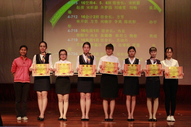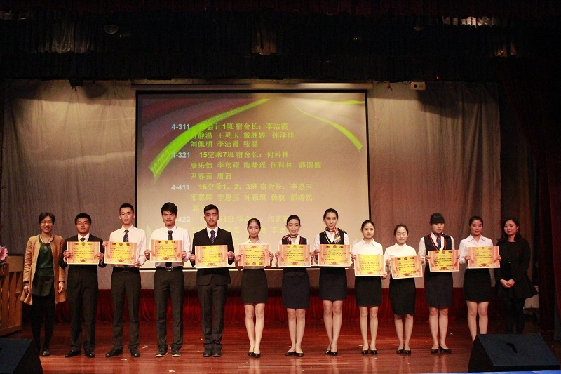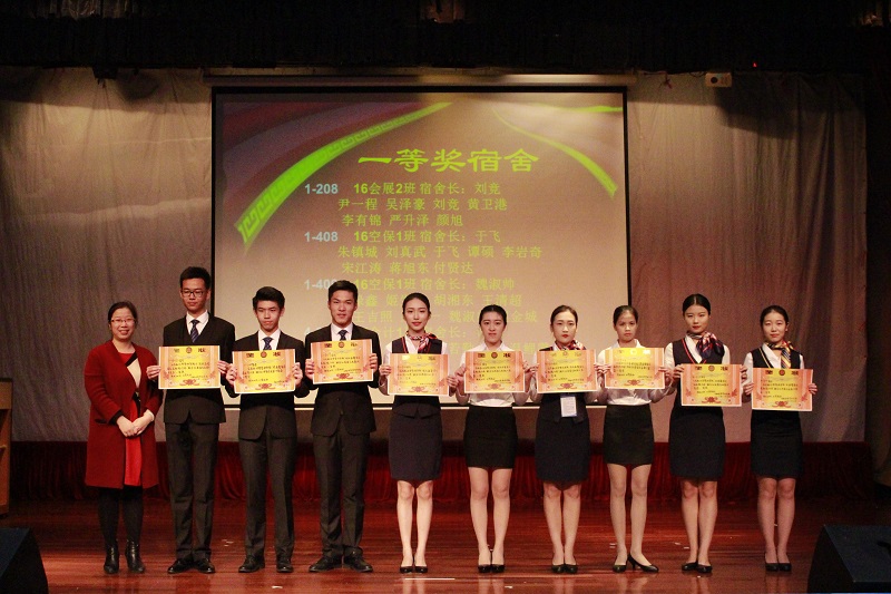 本次表彰中,1-208等9间宿舍荣获一等奖,4-311等11间宿舍荣获二等奖,4-712等14间宿舍荣获三等奖,16空保1班于飞等9人获得“优秀个人”荣誉称号。2016级空乘10班曾文杰等8人获得“优秀生活委员”荣誉称号。2016级空保3班李智等4人获得“优秀生活部干事”荣誉称号。