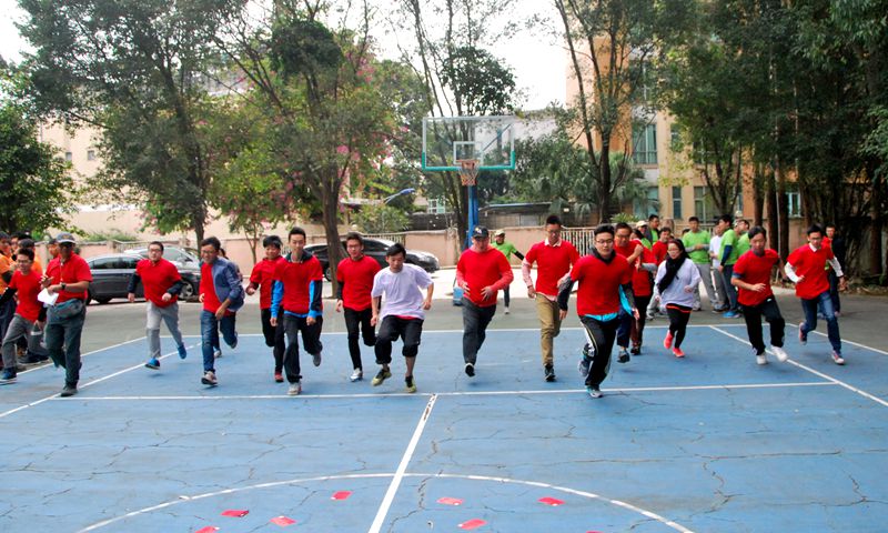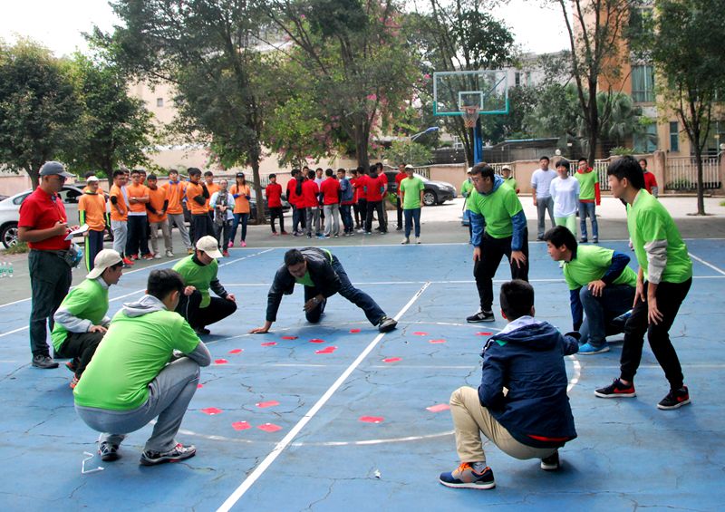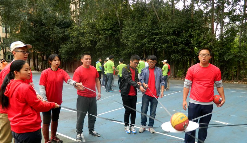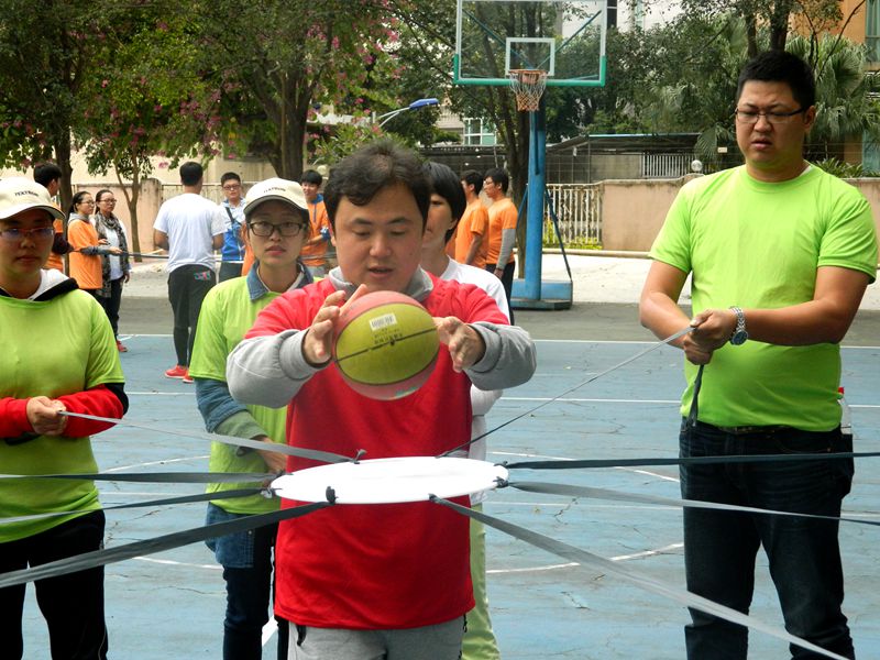 在丁力教练的带领下,学工团队分成了三支队伍,大家经历了“生死时速”,感受了“鼓舞飞扬”,完成了“定向寻宝”,探索了“水果迷宫”,体验了“七巧板”等拓展训练项目。其中,“鼓舞飞扬”项目要求团队呈圆形站立,每位成员拿起一根绳索,共同把团队正中心的塑料小圆板平衡托起,然后向上颠起一个皮球,通过数量竞技的方式培养队员们之间的合作协调能力和敢于实践的品质。“七巧板”项目要求在规定时间(40分钟)内,每组队员利用所持七巧板按照任务书的要求完成不同造型,旨在培养团队成员主动沟通的意识和合理配置资源的能力。参训过程中,全体师生都积极投入,尤其是在看似简单的“七巧板”项目失败后,大家均认真反思,努力找寻自身原因,学会更加理性地看待团队间的竞争关系。在拓展训练结束后,同学们纷纷表示看到老师们放下身份和面子参与学生们“看似幼稚”的团队训练,感觉很亲切。