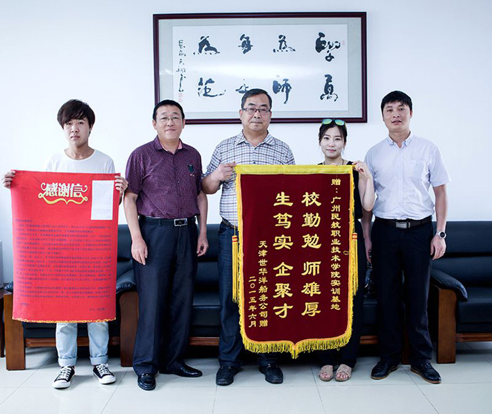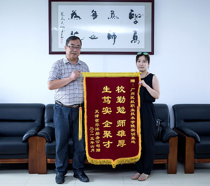 6月2日上午,天津世华洋船务公司人力资源部张聪经理一行专程访问我校白云机场校区,将一面印有“校勤勉,师雄厚,生笃实,企聚才”的锦旗赠送给了飞机维修工程学院。