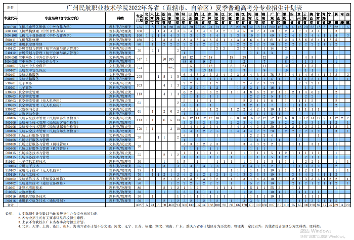广州民航职业技术学院2022年各省(直辖市、自治区)夏季普通高考分专业招生计划表