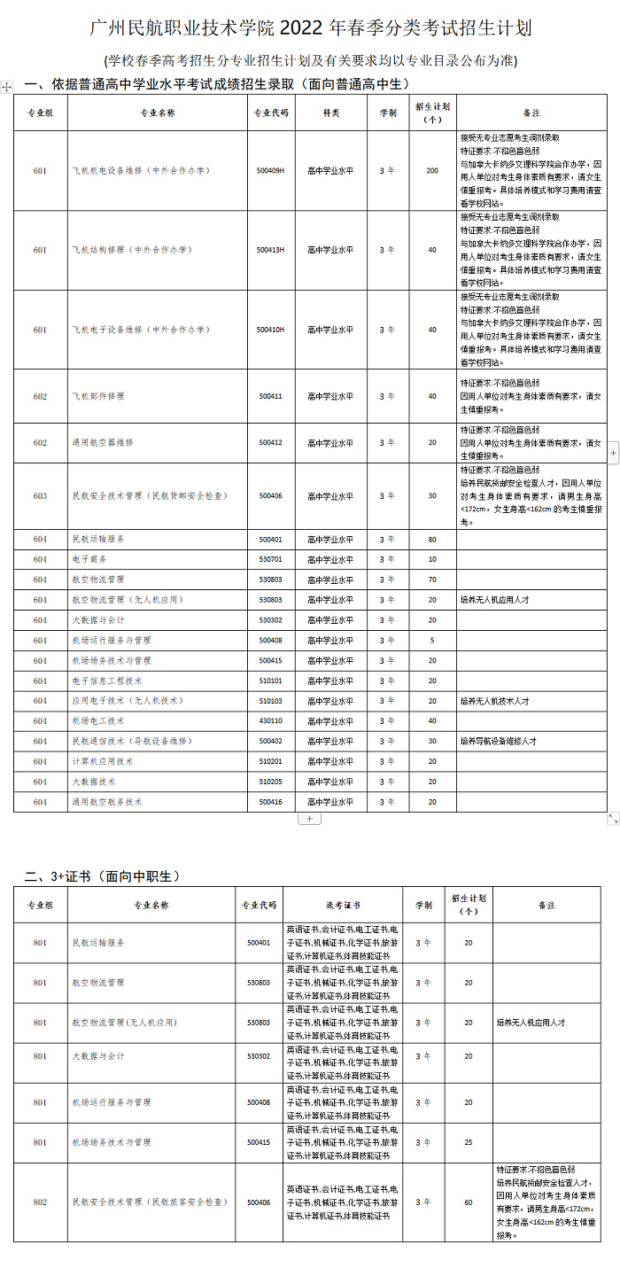 广州民航职业技术学院2022年春季分类考试招生计划