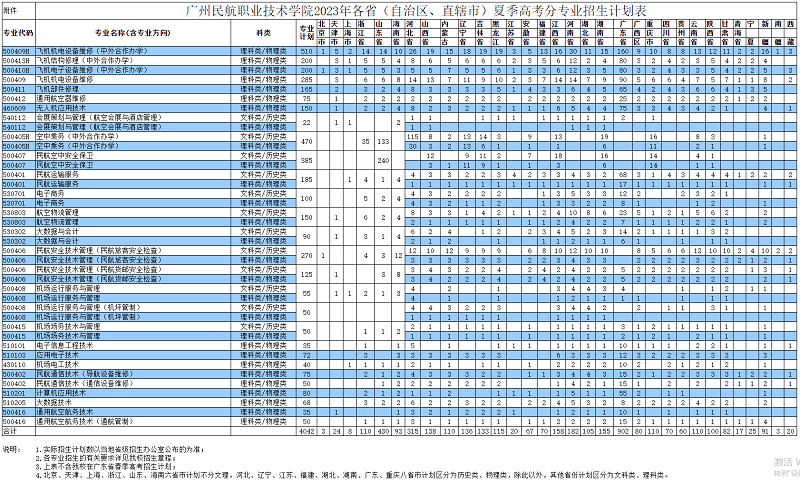 广州民航职业技术学院2023年各省(自治区、直辖市)夏季高考分专业招生计划表
