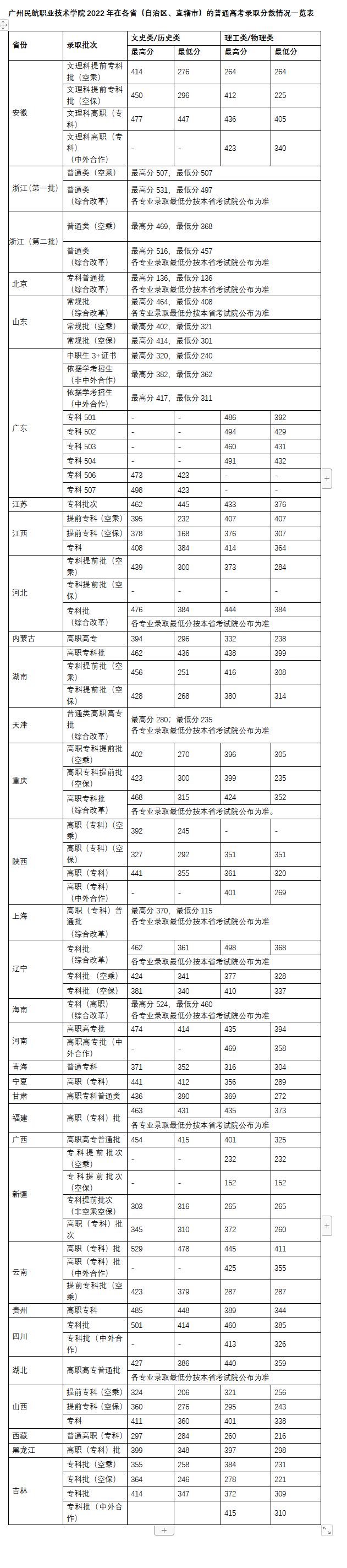 广州民航职业技术学院2022年在各省(自治区、直辖市)的普通高考录取分数情况一览表