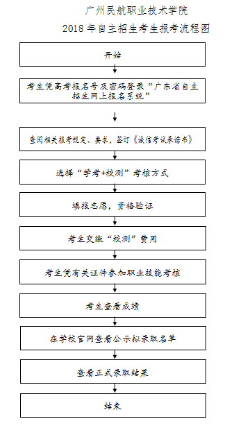 第二十条 拟报考我校自主招生的考生须在规定时间内登录“广东省2018年高职自主招生网上报名系统”(以下简称网上报名系统,网址:http://www.eesc.com.cn/gzks )使用高考报名号及密码进行报名,阅读相关报考规定、要求,签订《诚信考试承诺书》。考生须在规定时间内在网上报名系统选择“学考+校测”(普通高中毕业生)报考我校,按照操作指引,填报志愿及缴费,录入相关报名信息及按要求上传有关证明材料电子版等。逾期不再办理报名及志愿填报手续。考生报考我校自主招生流程详见附件2。