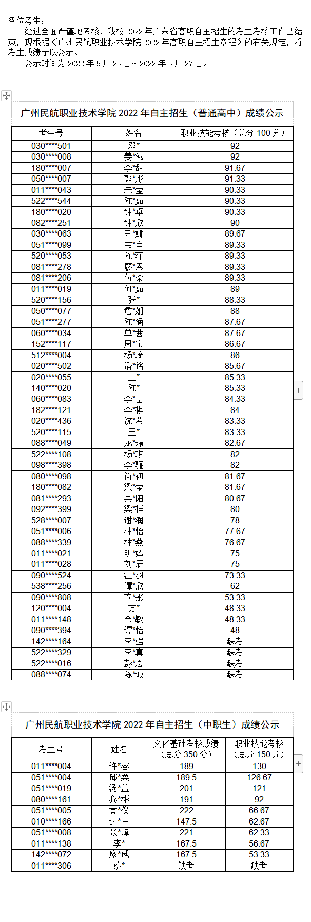 广州民航职业技术学院2022年广东省高职自主招生考生考核成绩的公示